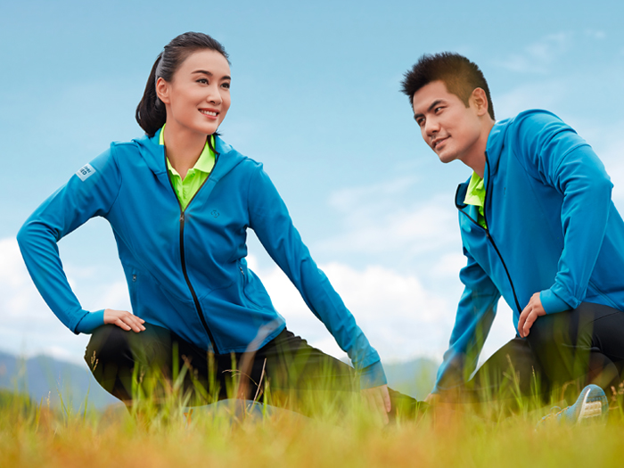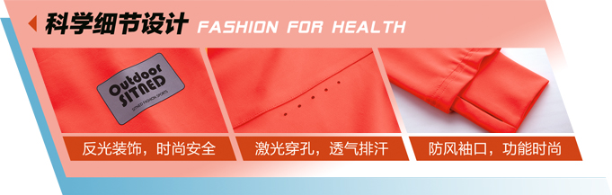 设计:这款针织上衣的款式设计,整体符合人体运动功能学的线条拼接,让穿着更合身更显身材,而帽、防风袖口和后背的燕尾设计极大的增加了服装的功能性和时尚性,局部的反光装饰标增加了夜跑的安全性,小块的激光穿孔点缀增加快速导汗和时尚性;环保染复合面料色彩艳丽,吸湿排汗效果好。